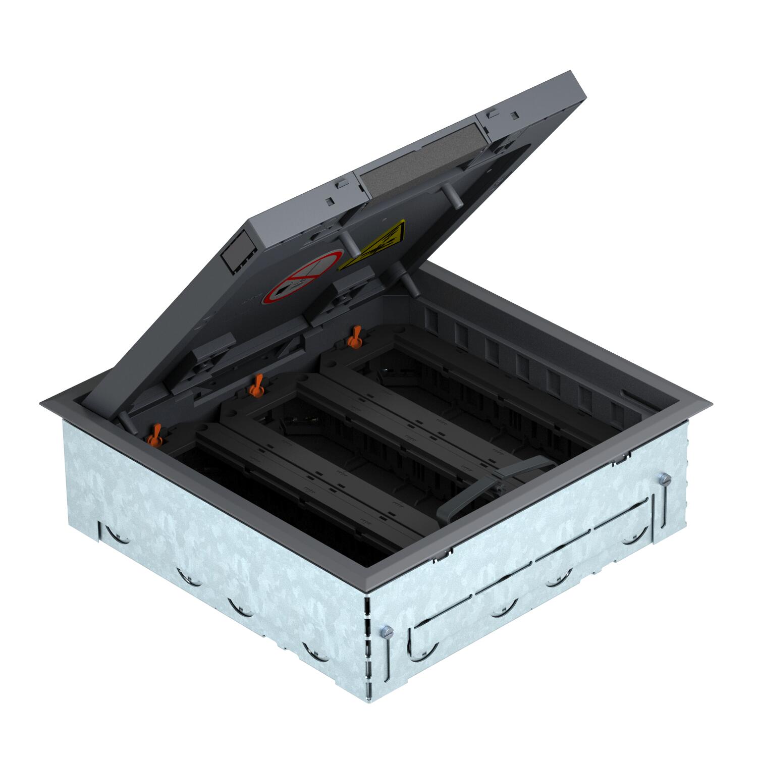 Description du produitUnité de montage carrée avec sortie de cordon destinée à être utilisée dans des chapes et planchers creux nettoyés à sec en intérieur, comprenant un boîtier de montage et un boîtier de sol GES9-3 (couleur gris fer ; RAL 7011) avec deux supports universels UT4. Boîtier de montage avec ouvertures d'insertion prédécoupées pour tubes d'installation (M25), réglage sur le rebord supérieur de la chape. Le boîtier de montage est livré fermé avec un couvercle plein. L'unité de montage d'appareillages avec boîtier de sol peut être inséré dans l'ouverture d'installation résultante après les travaux de chape. Évidement dans le couvercle rabattable du boîtier de sol 3, 5, 8 ou 10 mm.