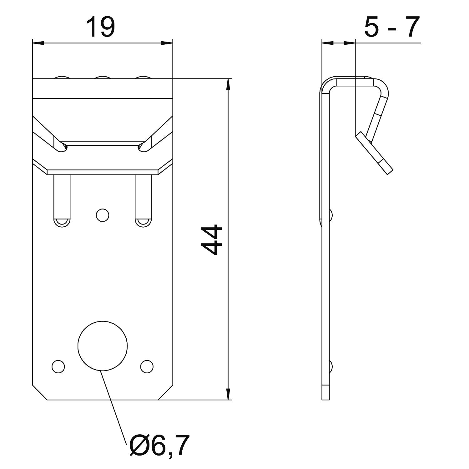 À charnière non Charge de rupture 0,72 kN Charnière ajustable non Couleur zinc Dimension 5-7mm Épaisseur de bride F max. 7 mm Épaisseur de bride F min. 5 mm Hauteur 10 mm Largeur 19 mm Longueur 43,5 mm Matériau Acier Surface Lamelle de zinc Type de fixation Bornes Type/élément de raccordement Trou - Tous les types