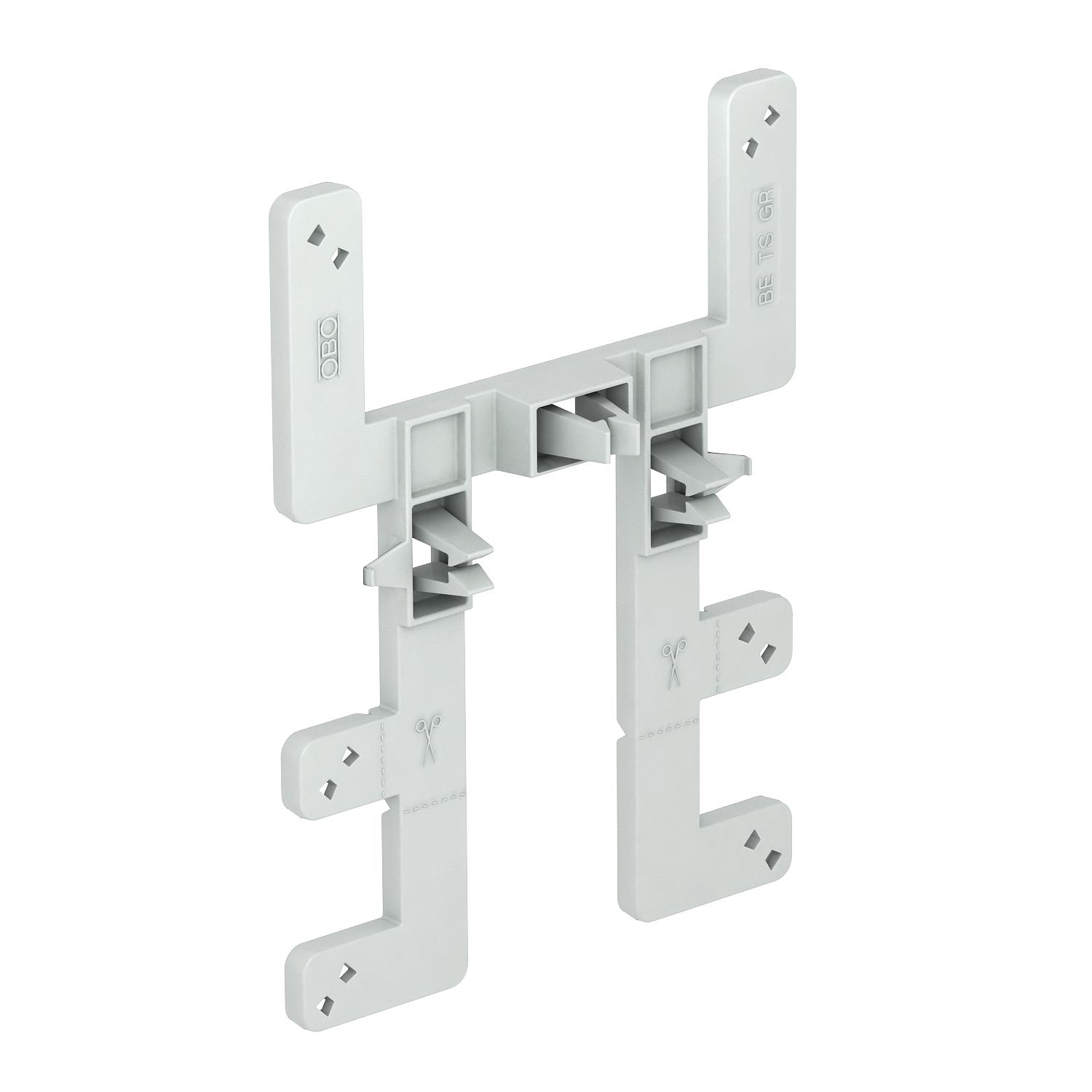 Description du produitÀ l'aide de l'élément de fixation BE TS GR, les boîtes de dérivation OBO de type T60 et T100 peuvent être fixées rapidement et sans outil sur les chemins de câbles en treillis.