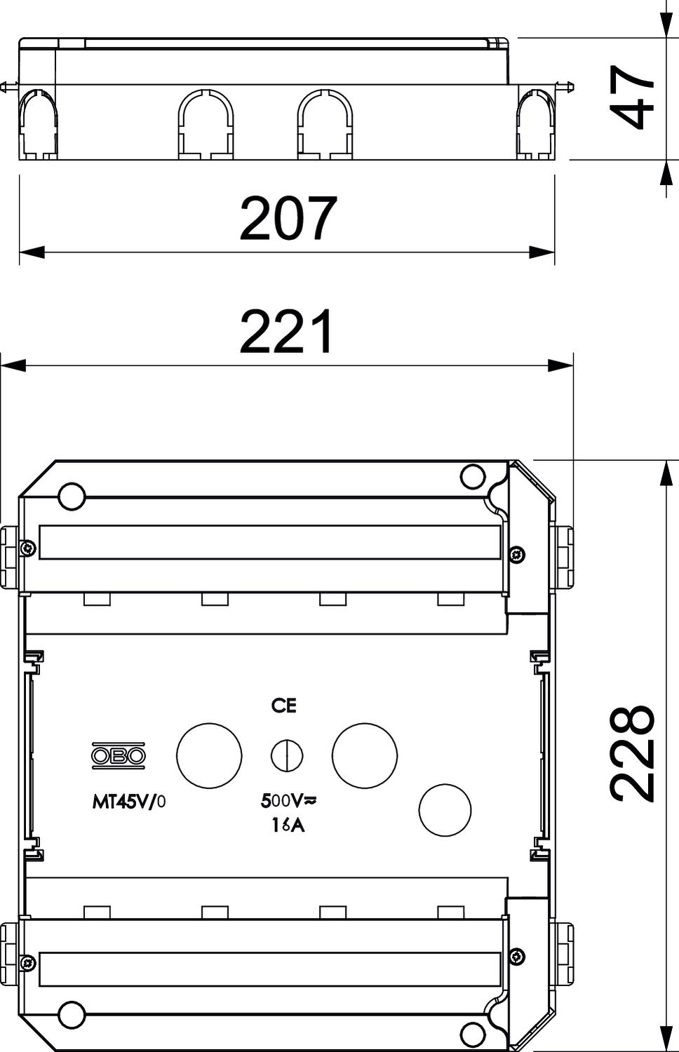 Le cadre de montage MT45V pour l’installation des appareils Modul 45 et les plaques de montage MPMT45 pour prises femelles de données peuvent être commandés séparément. Les perforations sur la paroi latérale pour l’entrée de tube ont un diamètre de 21 mm.