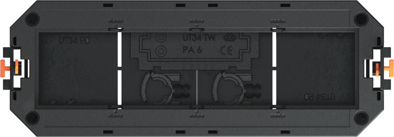 Panier support appareillages universel avec deux décharges de traction, séparateur et plaque de support d'appareillage UT4 P4 pour le montage de 4 Modul 45 dans un support d'appareillage OKB IT.