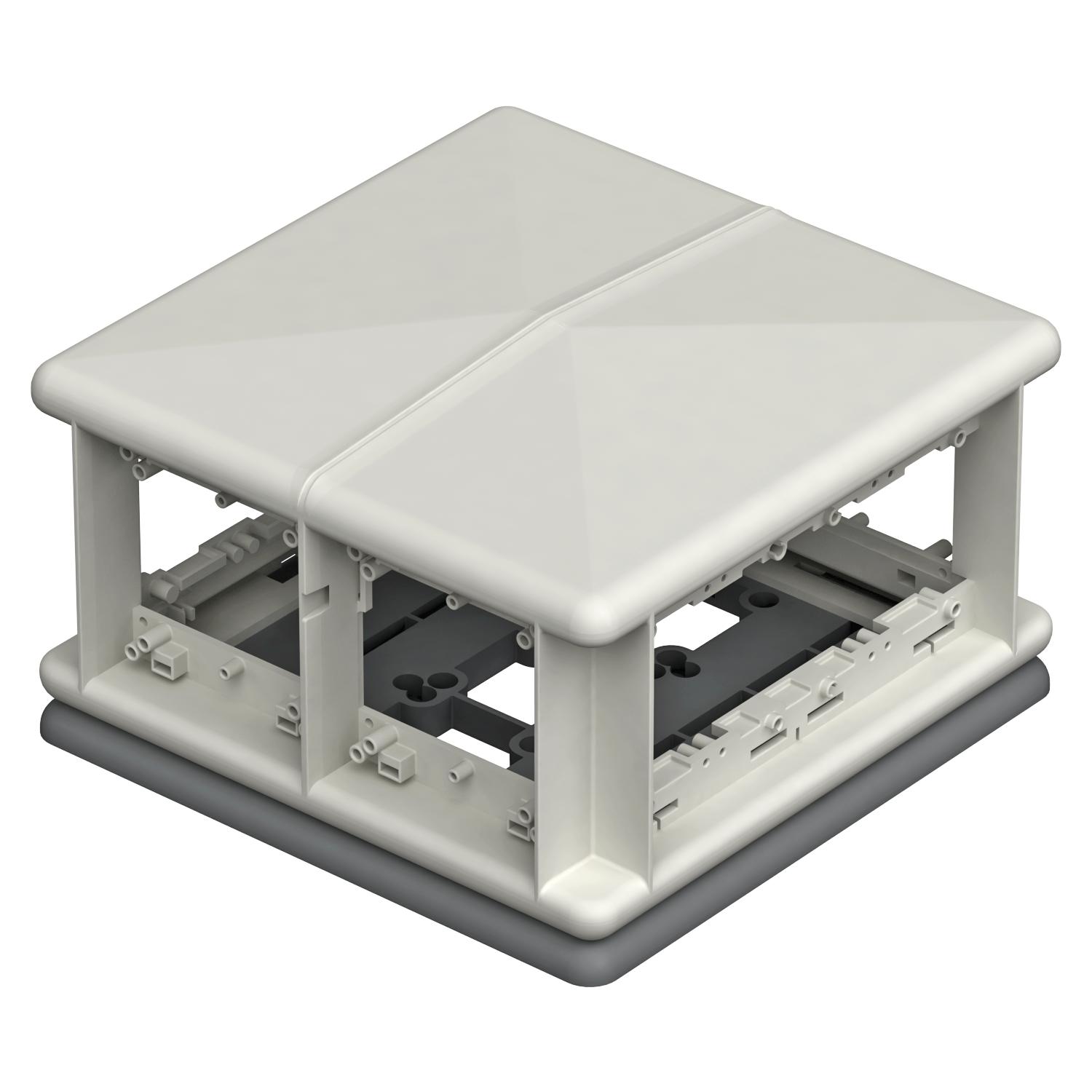 Description du produitUnité d'appareillages saillante pour le montage de 8 appareillages simples à griffe ou à vis sur 4 côtés. La séparation des natures de courant (4 + 4) est assurée par une cloison de séparation. En cas d'utilisation d'appareillages multiples, la capacité de raccordement peut être augmentée. Mode de fixation par vis pour appareillages 60 mm à la verticale.