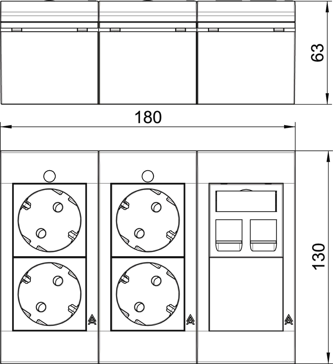 - 1 Prise double avec contact de protection, branchement à 33°, couleur : rouge, avec voyant lumineux comme témoin de contrôle.