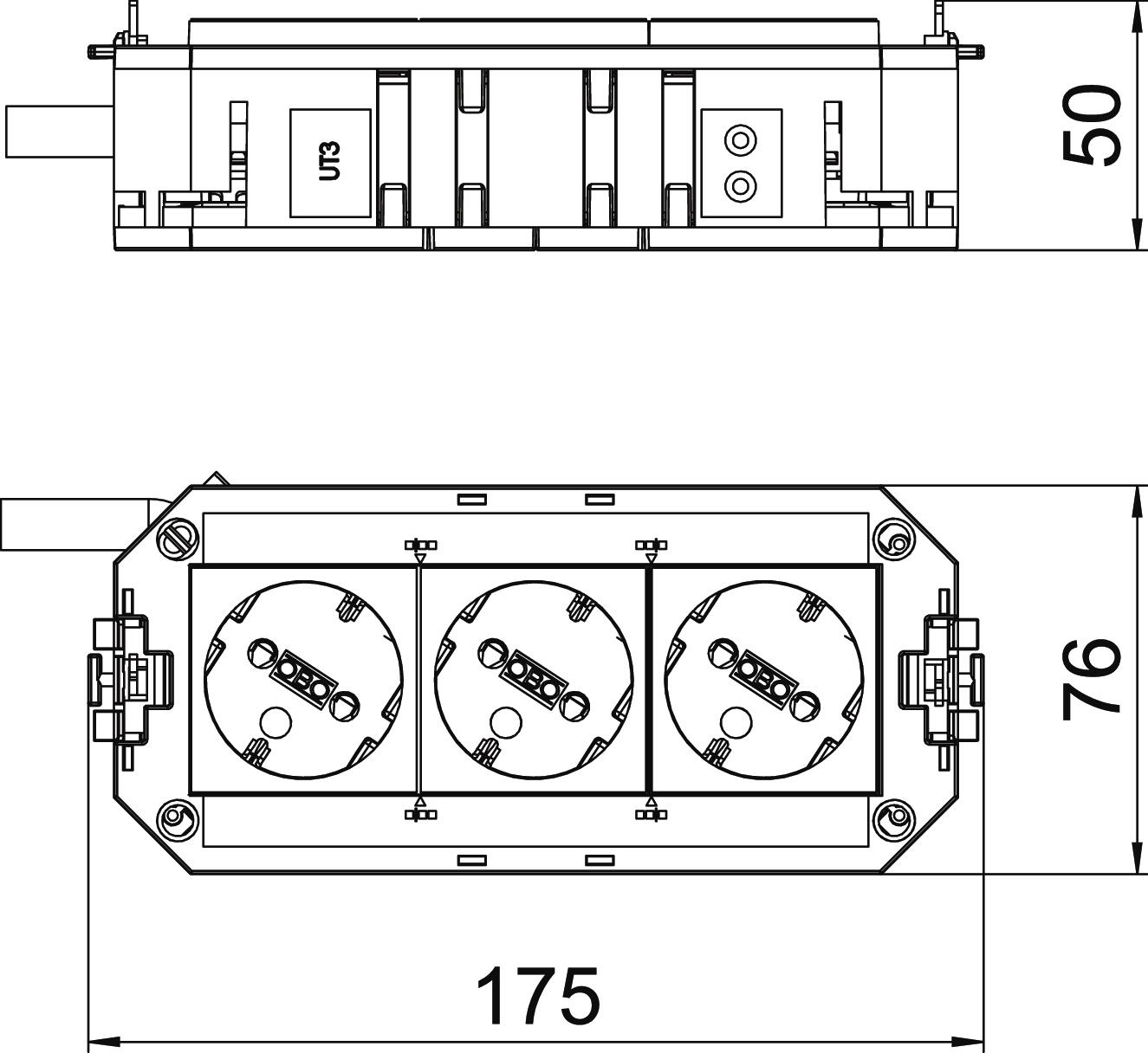 Le support universel prêt à raccorder UTC3 dispose de 3 prises à contact de protection à 33° préinstallées de couleur blanche avec 16 A.