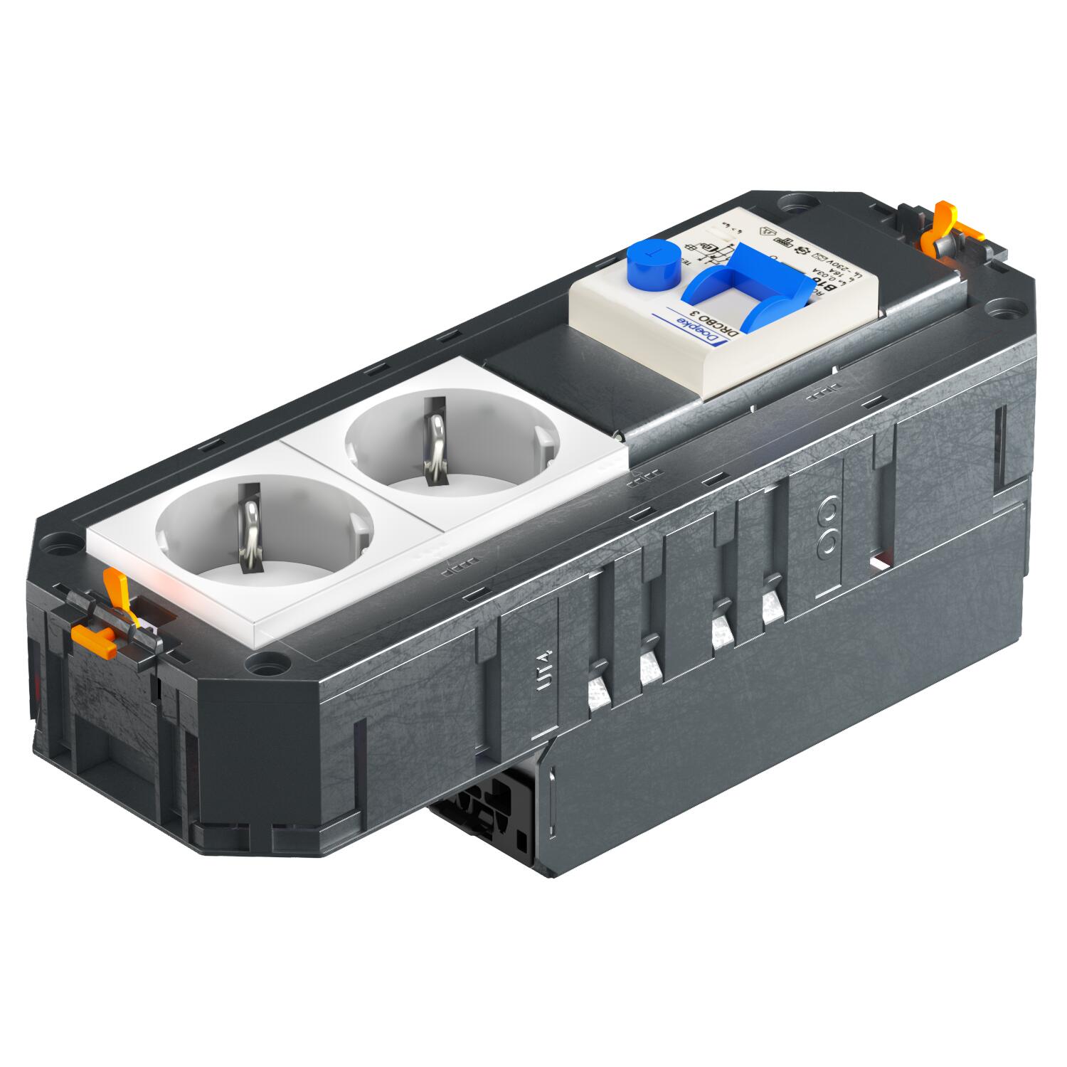 Le support universel prêt à raccorder UTC4 FI dispose de 2 prises à contact de protection, sécurisées avec interrupteur différentiel. Câblage interne avec 2,5 mm². Veuillez observer les conditions de raccordement (ainsi que la sélectivité !)