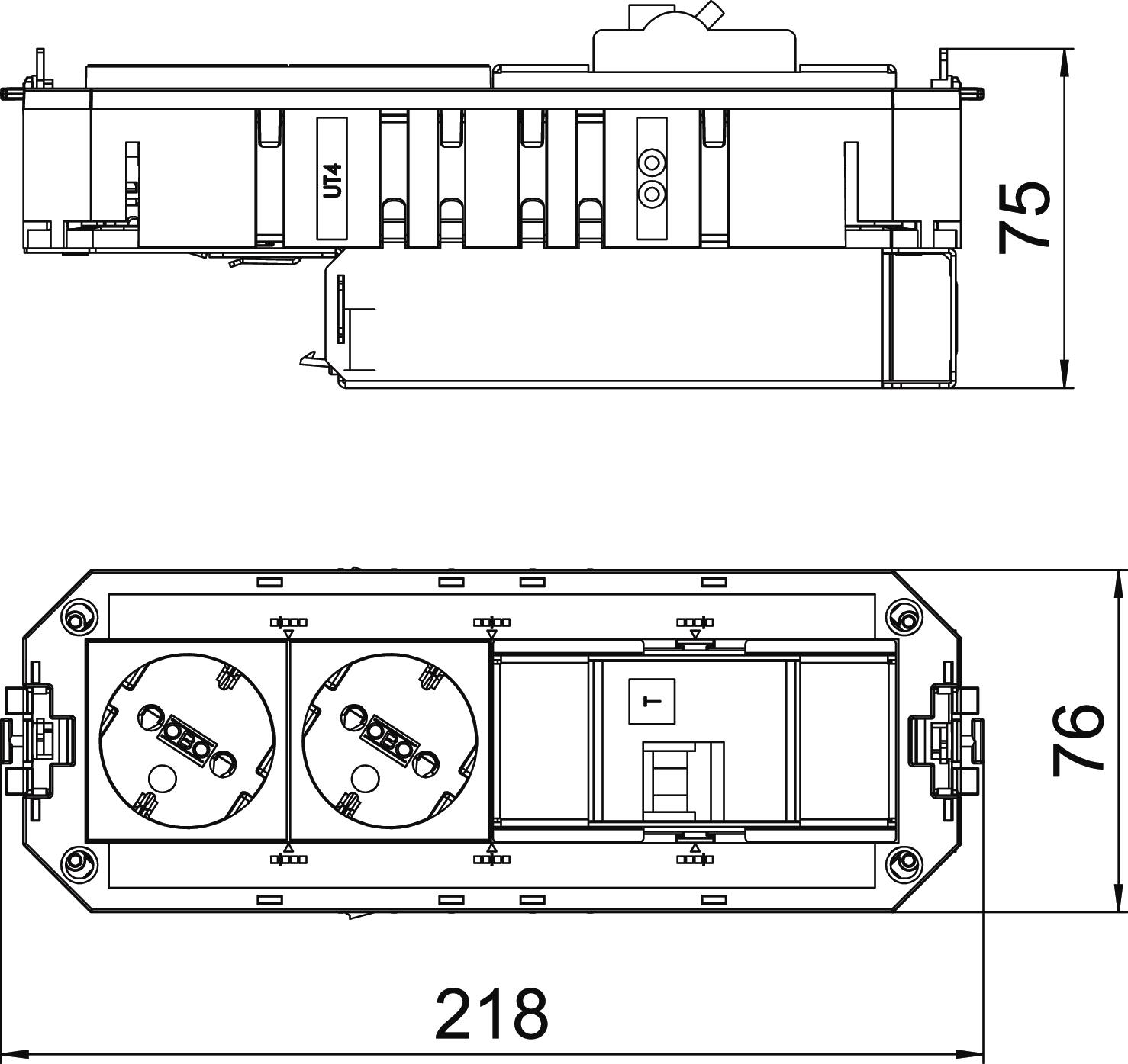 Le support universel prêt à raccorder UTC4 FI dispose de 2 prises à contact de protection, sécurisées avec interrupteur différentiel. Câblage interne avec 2,5 mm². Veuillez observer les conditions de raccordement (ainsi que la sélectivité !)