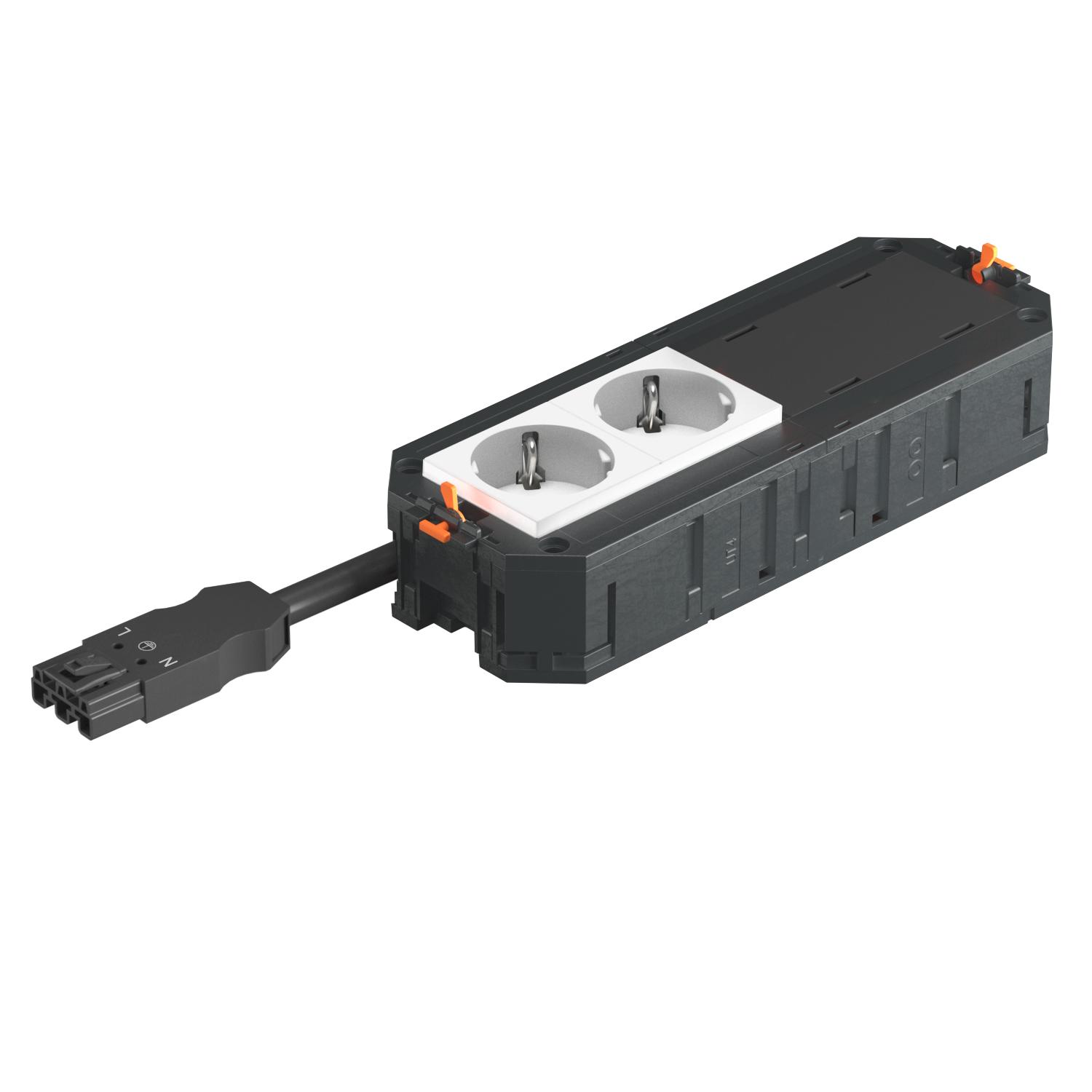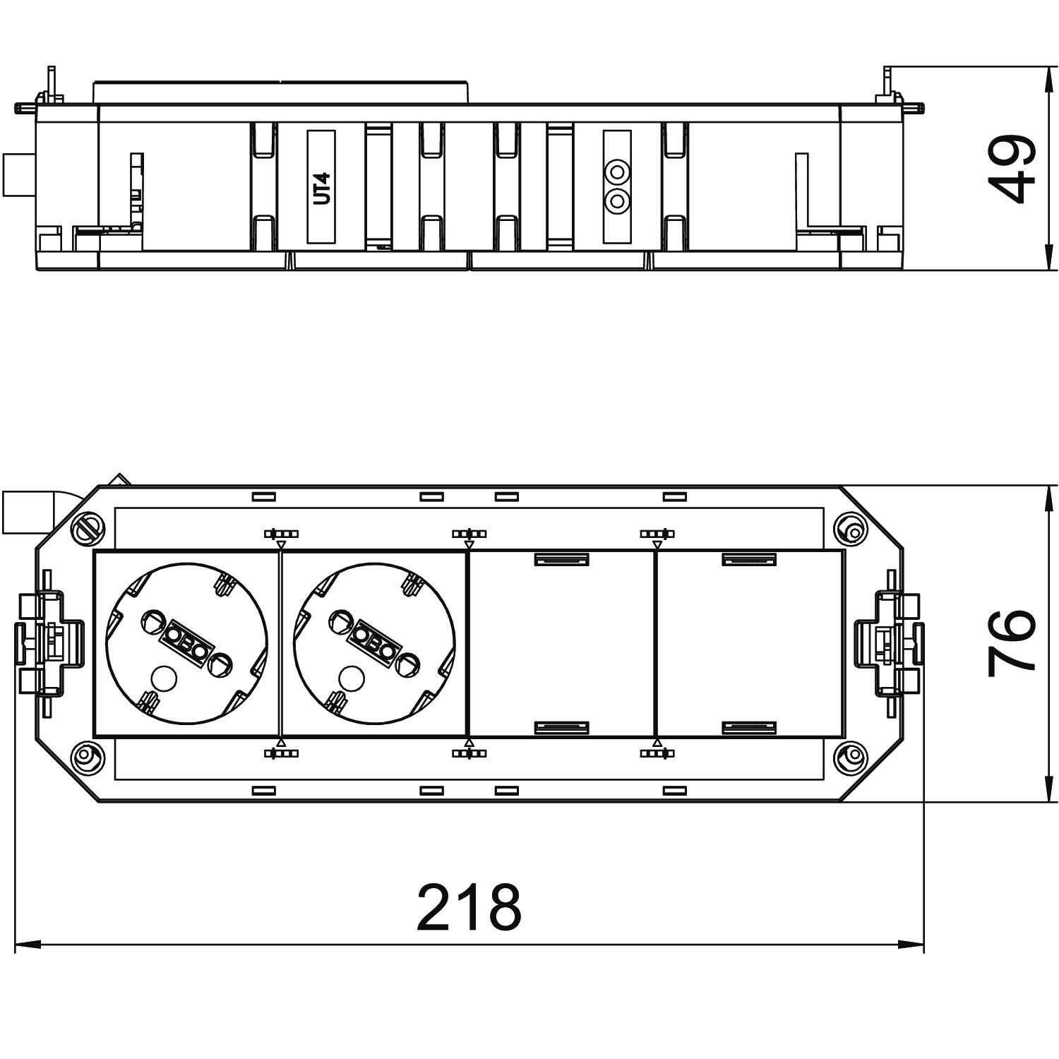 Le support universel prêt à raccorder UTC4 dispose de 2 prises de courant à contact de protection à 33° blanc pré-installées et 2 couvercles borgne pour le montage ultérieur de 2 dispositifs d'installation de la série Modul 45.