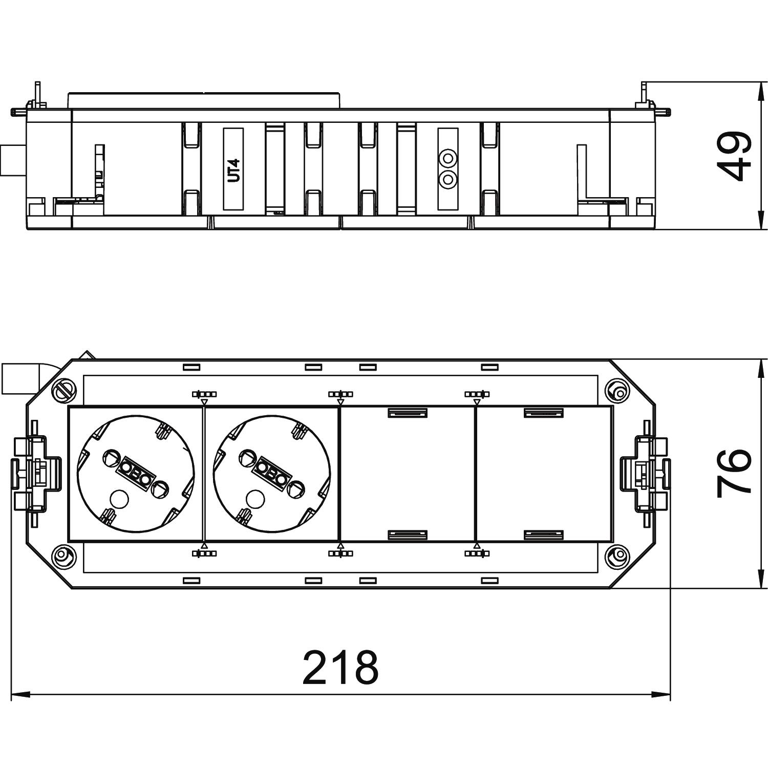 Le support universel prêt à raccorder UTC4 dispose de 2 prises de courant à contact de protection à 33° préinstallées, avec 16 A et 2 couvercles borgne pour le montage ultérieur de 2 appareillages de la série Modul 45.