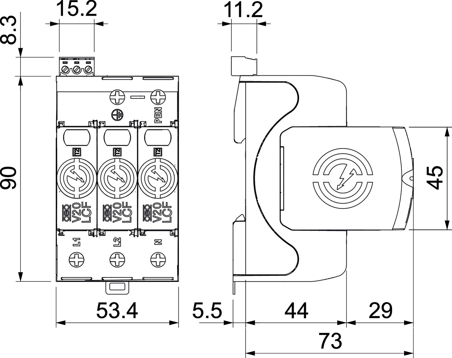 Description du produitParafoudre type 2 • Pour la liaison équipotentielle de protection contre les surtensions selon NF C 15 100 (IEC 60364-4-44) • Capacité d'écoulement jusqu'à 40 kA (8/20) par pôle grâce à des varistances haute performance • Parafoudre modulaire débrochable avec dispositif de coupure dynamique et voyant d'état • Mécanisme de verrouillage avec protection contre les vibrations et codage de tension • Plastique retardateur de la flamme selon UL 94 V-0 • Les variantes FS possèdent un contact inverseur libre de potentiel pour le report d'alarme Application : liaison équipotentielle dans les tableaux généraux et divisionnaires.