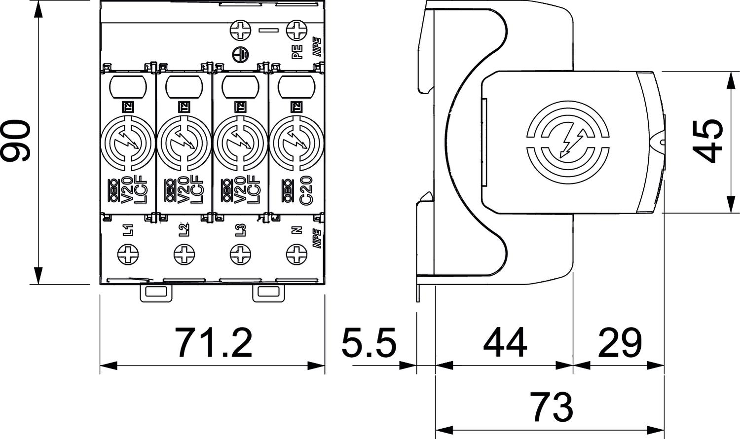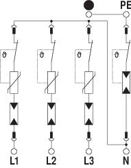 Description du produitParafoudre type 2 • Pour la liaison équipotentielle de protection contre les surtensions selon NF C 15 100 (IEC 60364-4-44) • Capacité d'écoulement jusqu'à 40 kA (8/20) par pôle grâce à des varistances haute performance • Parafoudre modulaire débrochable avec dispositif de coupure dynamique et voyant d'état • Mécanisme de verrouillage avec protection contre les vibrations et codage de tension • Plastique retardateur de la flamme selon UL 94 V-0 • Les variantes FS possèdent un contact inverseur libre de potentiel pour le report d'alarme Application : liaison équipotentielle dans les tableaux généraux et divisionnaires.