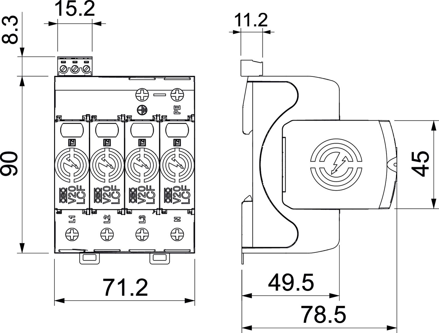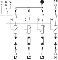 Description du produitParafoudre type 2 • Pour la liaison équipotentielle de protection contre les surtensions selon NF C 15 100 (IEC 60364-4-44) • Capacité d'écoulement jusqu'à 40 kA (8/20) par pôle grâce à des varistances haute performance • Parafoudre modulaire débrochable avec dispositif de coupure dynamique et voyant d'état • Mécanisme de verrouillage avec protection contre les vibrations et codage de tension • Plastique retardateur de la flamme selon UL 94 V-0 • Les variantes FS possèdent un contact inverseur libre de potentiel pour le report d'alarme Application : liaison équipotentielle dans les tableaux généraux et divisionnaires.