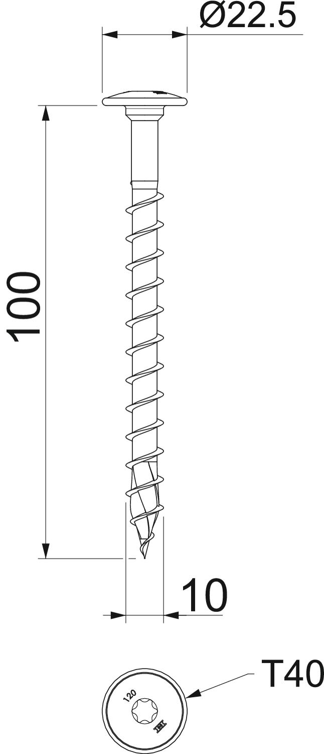 À deux filets non Cote D 10 mm Cote L 100 mm Couleur zinc Diamètre de la tête 22,5 mm Diamètre de tige 7 mm Dimension 10x100 Forme de la tête Tête assiette Longueur 100 mm Matériau Acier Surface galvanisé Système à visser Torx trempé oui - Tous les types
