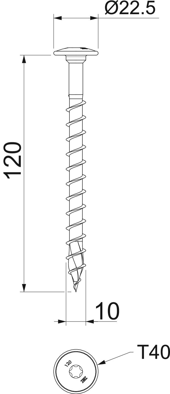 À deux filets non Cote D 10 mm Cote L 120 mm Couleur zinc Diamètre de la tête 22,5 mm Diamètre de tige 7 mm Dimension 10x120 Forme de la tête Tête assiette Longueur 120 mm Matériau Acier Surface galvanisé Système à visser Torx trempé oui - Tous les types