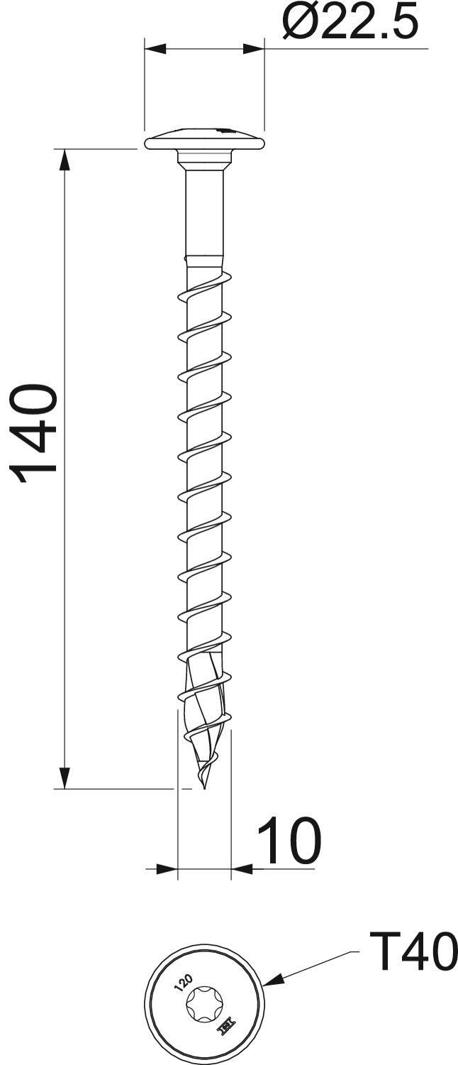 À deux filets non Cote D 10 mm Cote L 140 mm Couleur zinc Diamètre de la tête 22,5 mm Diamètre de tige 7 mm Dimension 10x140 Forme de la tête Tête assiette Longueur 140 mm Matériau Acier Surface galvanisé Système à visser Torx trempé oui - Tous les types
