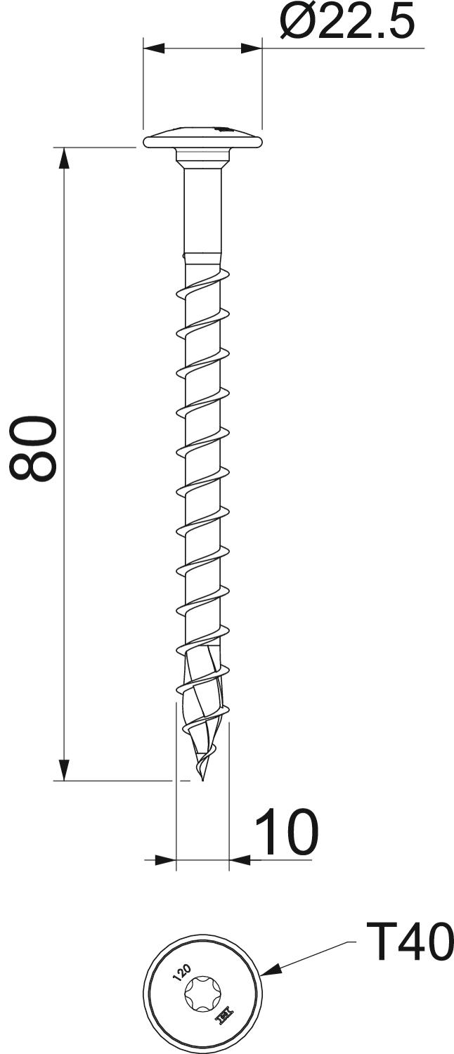 À deux filets non Cote D 10 mm Cote L 80 mm Couleur zinc Diamètre de la tête 22,5 mm Diamètre de tige 7 mm Dimension 10x80 Forme de la tête Tête assiette Longueur 80 mm Matériau Acier Surface galvanisé Système à visser Torx trempé oui - Tous les types
