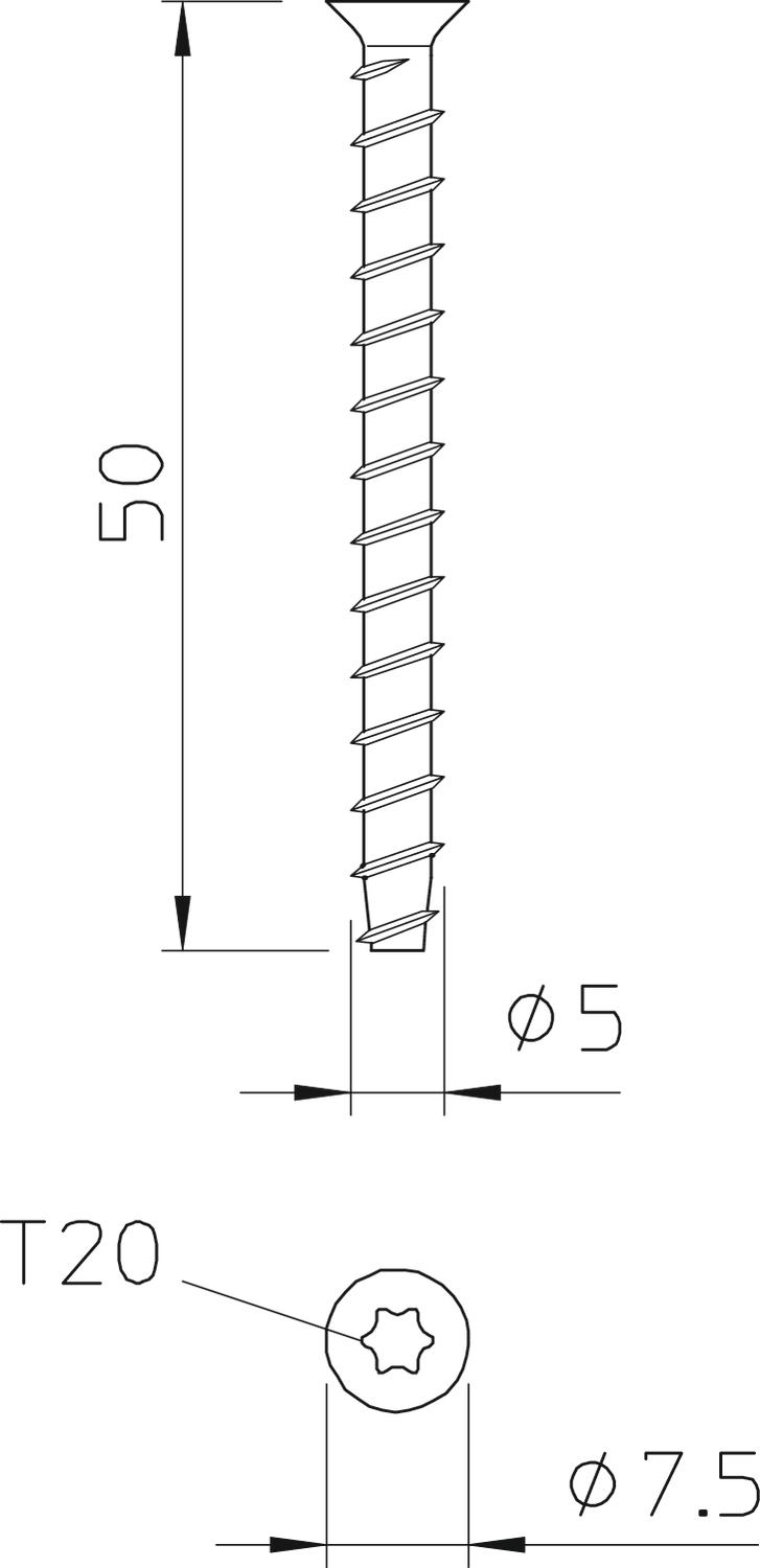 Cote L 50 mm Couleur zinc Diamètre de la tête 7,5 mm Diamètre de perçage min. 4 mm Diamètre du filetage ST 5 Dimension 5x50mm Dimensions 5 x 50 Forme de la tête Tête fraisée Longueur 50 mm Longueur de cheville 50 mm Matériau Acier Surface galvanisé Système à visser Torx - Tous les types