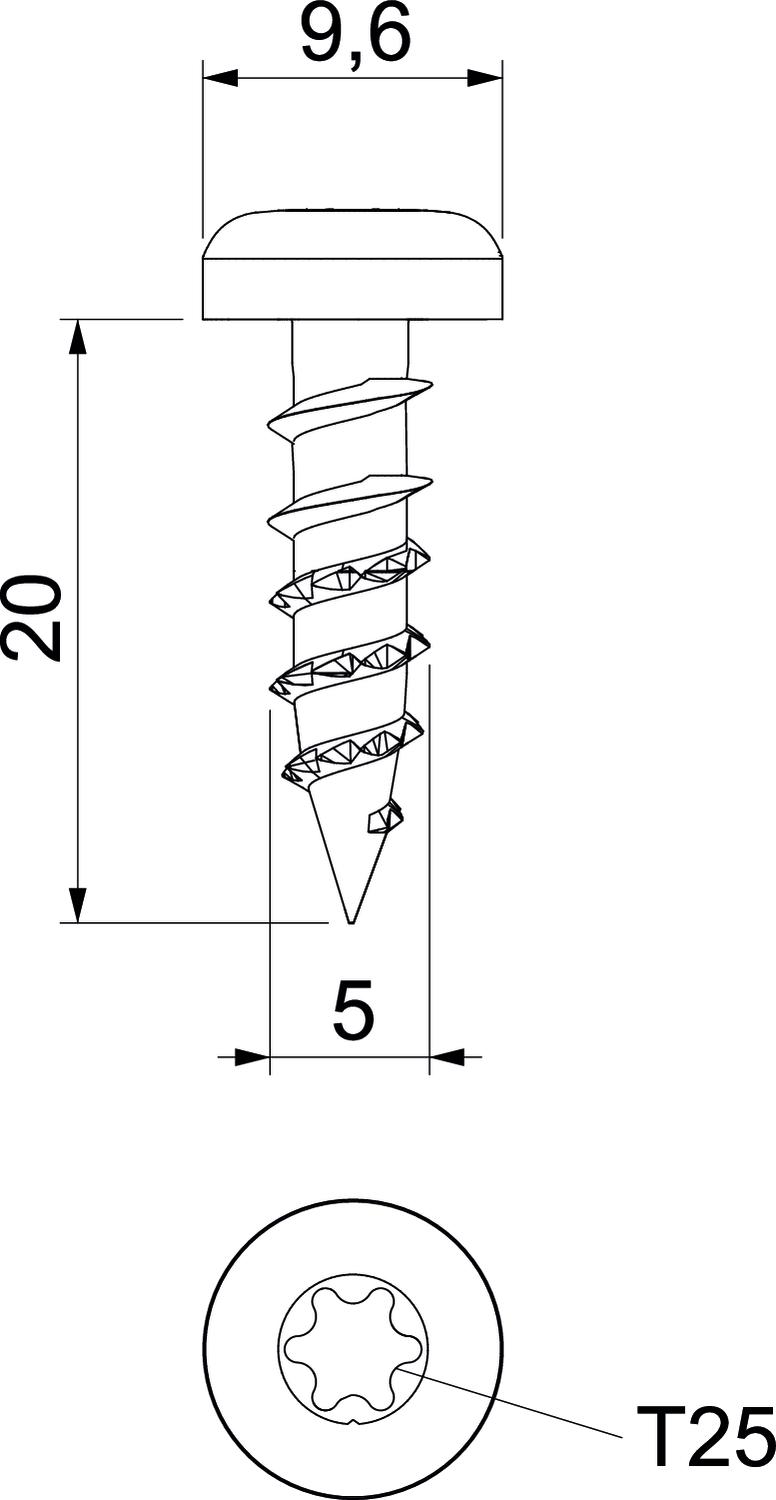 Cote D 9,6 mm Cote d 5 mm Cote L 20 mm Couleur zinc Diamètre du filetage ST 5 Dimension 5x20 Forme de la tête autres Longueur 20 mm Matériau Acier Surface galvanisé, passivé transparent Système à visser Torx - Tous les types
