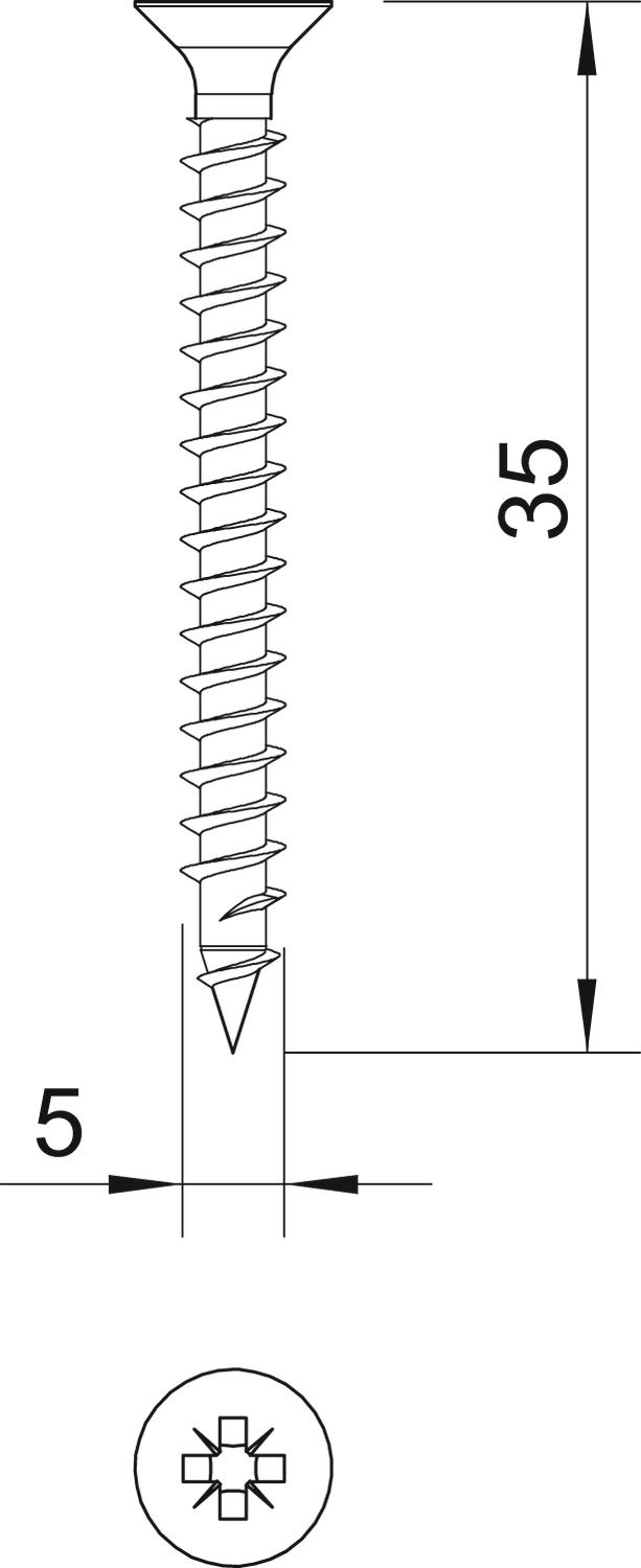 Cote D 5 mm Cote L 35 mm Diamètre de la tête 9,2 mm Dimension 5x35mm Forme de la tête Tête fraisée Longueur 35 mm Matériau Acier Surface galvanisé Système à visser Pozidriv PZ trempé oui - Tous les types