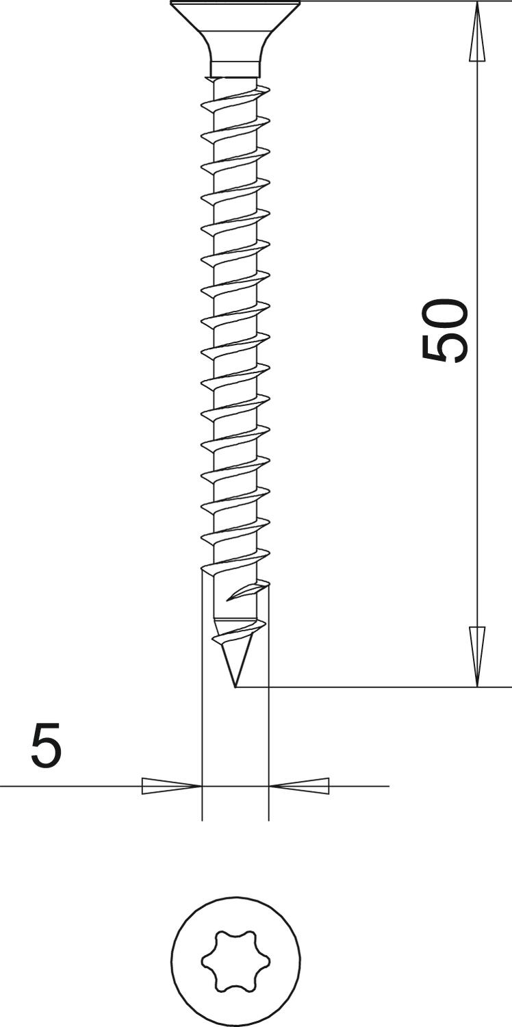 Cote D 5 mm Cote L 50 mm Diamètre de la tête 9,2 mm Dimension 5x50mm Forme de la tête Tête fraisée Longueur 50 mm Matériau Acier Surface galvanisé Système à visser Torx trempé oui - Tous les types