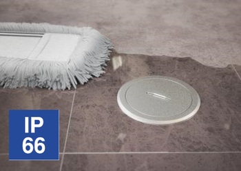 Tous les boîtiers GES R2 avec couvercle métallique ont obtenu la certification VDE avec l'indice de protection IP66 à l'état fermé. Cela signifie que, couvercle fermé, le matériel électrique qu'il contient est parfaitement protégé d'un jet d'eau puissant. Ainsi, les boîtiers sous chape GES R2 représentent la solution idéale pour les sols dans des zones où la protection contre les jets d'eau est impérative, car le sol est nettoyé à l'eau avec des laveuses. Comme dans des halls ou des centres commerciaux par exemple.