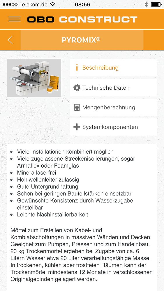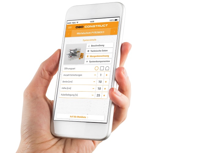 Application mobileDe nos jours, la protection contre les incendies présente à beaucoup d’installateurs, spécialisés dans l’équipement technique des bâtiments, de nombreux obstacles apparemment insurmontables. L'application OBO Construct BSS vous aide à choisir les produits de protection contre les incendies adaptés, pour vos installations électriques.