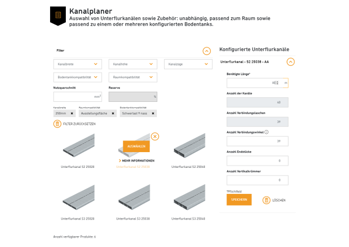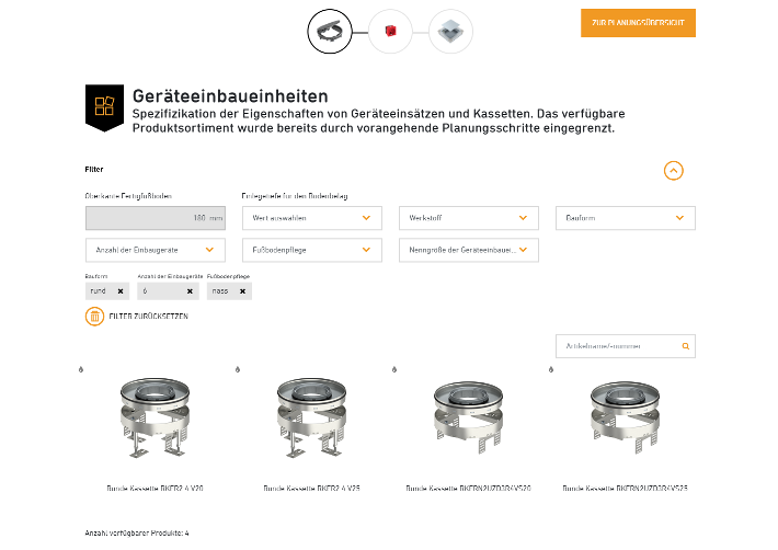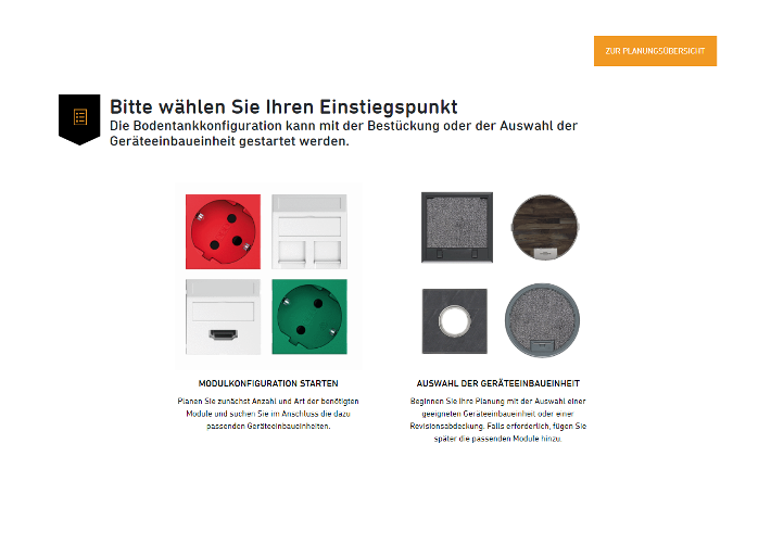 Application webAvec l'aide à la planification OBO Construct pour les systèmes sous-chape, vous pouvez, au sein d'un projet, créer des trappes de visite aussi bien pour les faux-planchers et les planchers creux que pour les systèmes de goulottes sous chape.