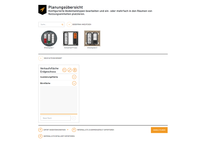 Cela est rendu possible par une vue d'ensemble de la planification, claire et structurée, qui constitue la pièce maîtresse du configurateur. Il est ici possible de créer des modèles de types de trappes de visite et de les utiliser à maintes reprises dans les unités d'utilisation et les pièces définies par l'utilisateur.