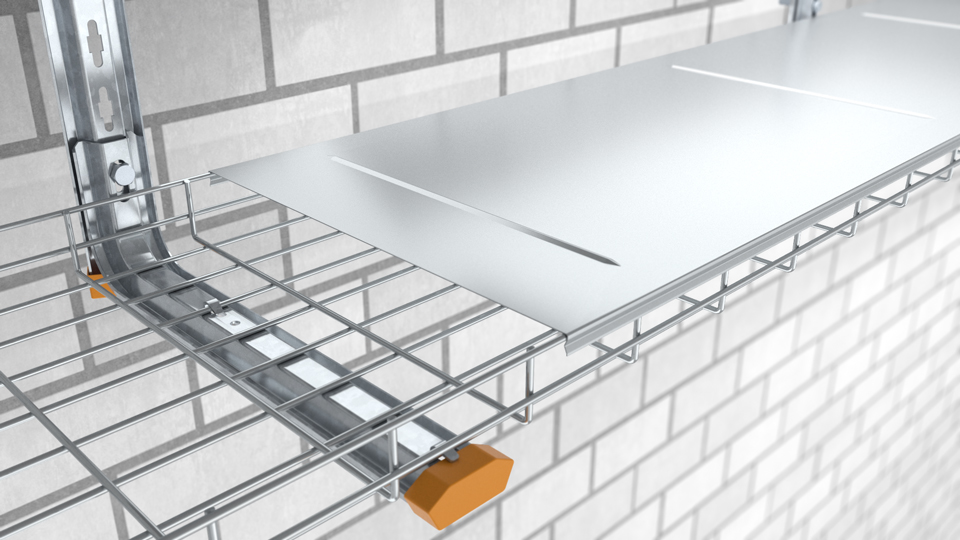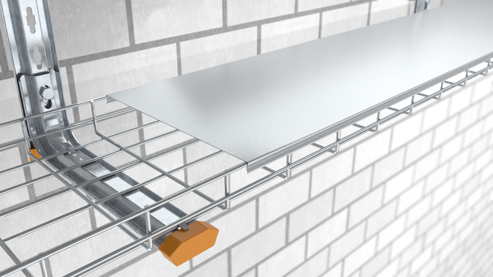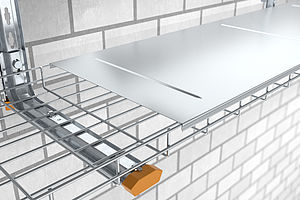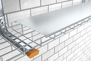 Un profilé polyvalent spécial qui s'encliquette facilement par le haut sur les fils métalliques des chemins de câbles en treillis est appliqué au niveau des arêtes longitudinales du couvercle. Aucun outil ni accessoire supplémentaire n'est nécessaire pour le montage et le démontage. La structure particulière du couvercle favorise l'écoulement de substances liquides et protège ainsi câbles et conduites contre divers facteurs extérieurs tels que les salissures et l'humidité.