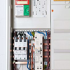 Les nouvelles règles techniques de raccordement basse tension VDE-AR-N 4100 pour le raccordement d'installations de clients au réseau basse tension exigent que l'appareil de protection contre les surtensions se trouve le plus près possible de la source électrique. Le est installé, selon la règle de raccordement, dans l'espace de raccordement inférieur et ainsi, directement à la source électrique, protège efficacement contre les surtensions. L'installation sur le système de barre omnibus de 40 mm de l'armoire du compteur permet un montage particulièrement simple et rapide.