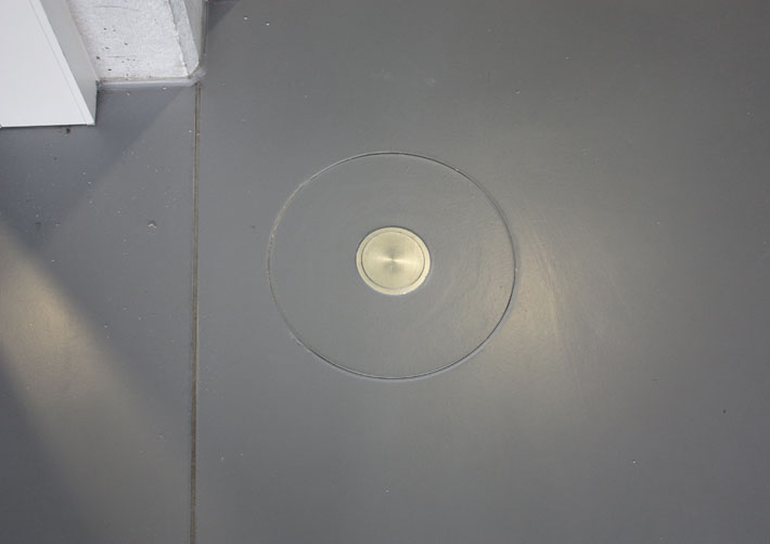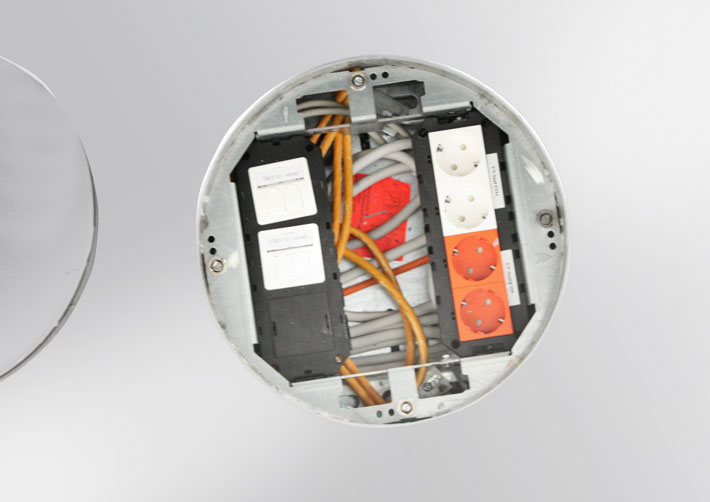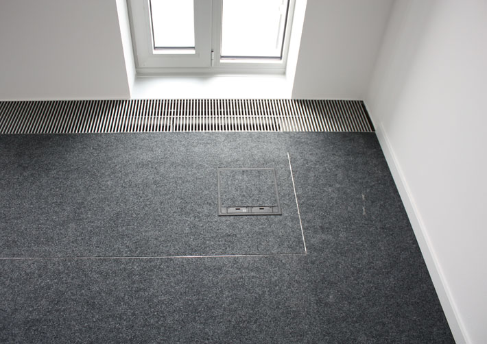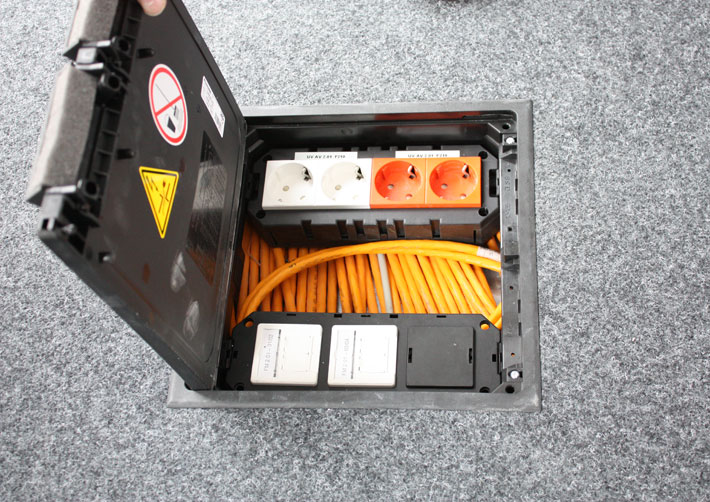Les salles de conférence du rez-de-chaussée sont dotées de prises de courant et de prises informatiques grâce au système de conduits sous-chape EÜK combiné à des cassettes rondes VA. L'utilisation de cassettes à tube rétractable pour la sortie de câbles permet un nettoyage à l'eau des planchers. Les évidements pour insertion de revêtement de sol des cassettes VA sont anodisés et assortis au plancher tout en s'intégrant parfaitement à l'optique du sol.