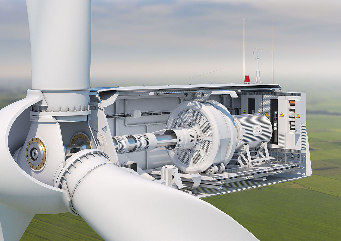 La nacelle repose sur la tour de l’éolienne. Les deux parties sont reliées l’une à l’autre par une articulation rotative. Sur la face avant de la nacelle, se trouve le rotor, composé d’un moyeu et des différentes pales du rotor. Les charges résultant du rotor et de tous les composants installés sont déviées par la nacelle vers les fondations, par l’intermédiaire de la tour.